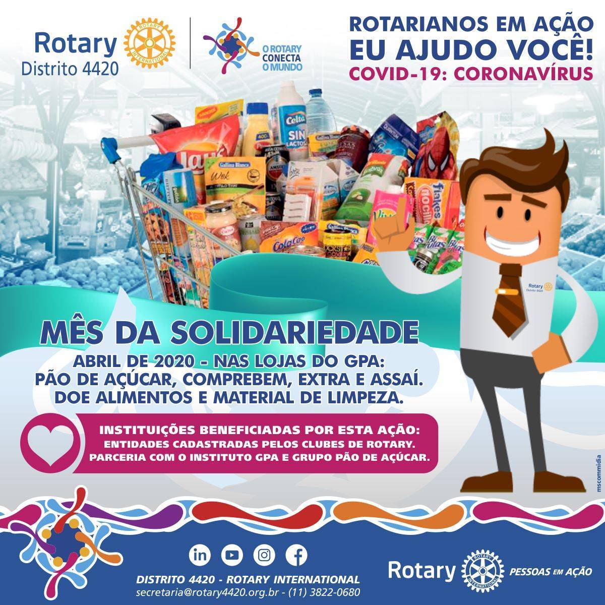 Rotary Distrito 4420 e Instituto GPA repetem ação de combate à fome em contingência ao COVID-19. Oriunda do Dia de Solidariedade, que ocorre tradicionalmente em dezembro, visando a doação de alimentos no mês natalino, campanha volta com força total no mês de abril de 2020, minimizando os efeitos do CORONAVÍRUS na entidades assistenciais. Muitas instituições beneficentes estão com os estoques desabastecidos pela baixa circulação de pessoas e diminuição das doações voluntárias. Procure uma das lojas do GPA - Grupo pão de Açúcar (Pão de Açúcar, CompreBem, Extra e Assaí) ou um clube de Rotary mais próximo para fazer sua doação. Juntos somos mais fortes!